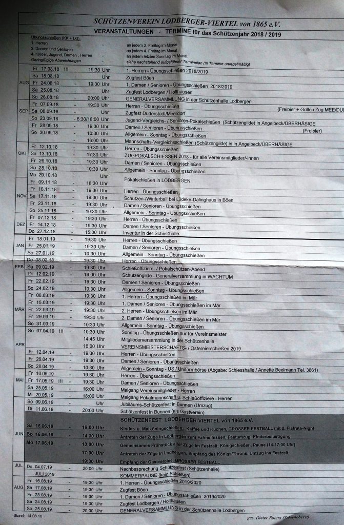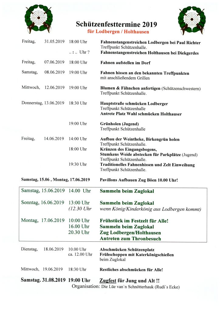 Die aktuellen Termin für die Vorbereitung unseres Schützenfestes am 15.-17.06.2019.